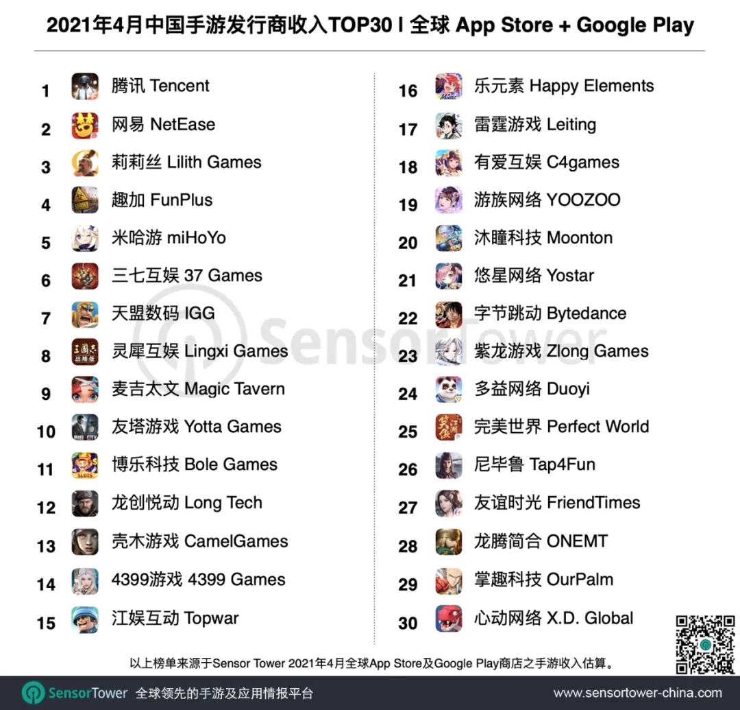 2021 年 4 月中国手游发行商全球收入排行榜:腾讯网易莉莉丝前三