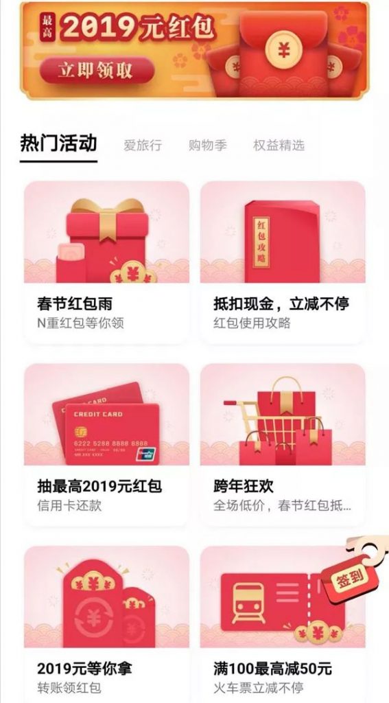云闪付这次先声夺人,推出最高2019元的现金红包,外加出境游多重优惠;2019年1月5日至2月4日,云闪付推出“扫标识 领红包”活动,用户扫“银联标识或云闪付标识”参加领红包活动,可有时机最高领2019元红包,同一用户每天最多领3次红包。依据活动规矩,每天发放不少于2000万个红包,数量有限,领完停止。