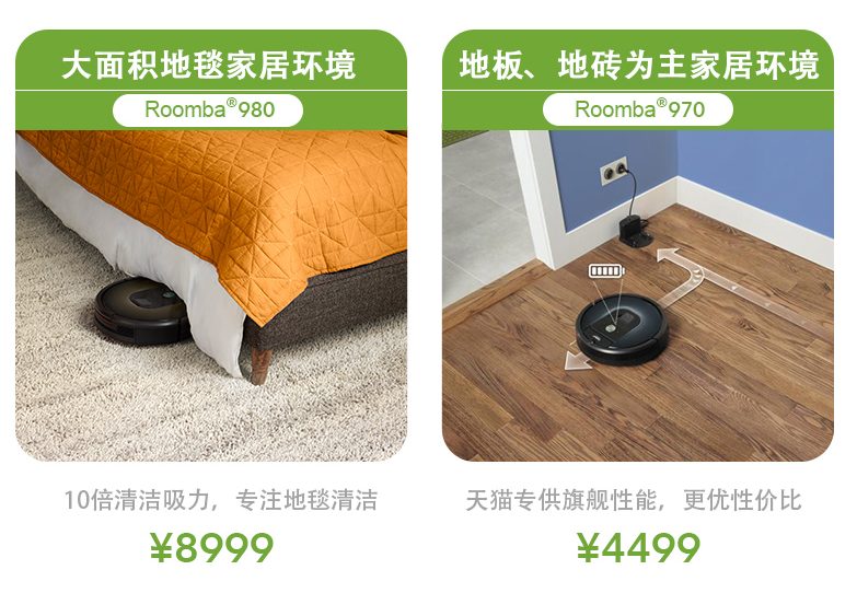 iRobot扫地机器人 新推出了一款旗舰 Roomba970 ,它的定位和980相同是大户型导航吸尘机器,有所不同的是它可以经过阿里的智能语音音箱产品天猫精灵进行语音操控以及更适合地砖地板为主的中国式家庭的运用场景。当然最重要的是价格上只需上代旗舰一半的价格——4299元。