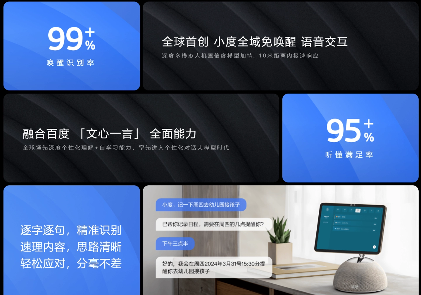 DuerOS X 交融百度“文心一言”全面才能,支撑小度全域免唤醒语音交互,声称“唤醒识别率 99%+、听懂满意率 95%+”。